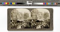 View looking down Race Street in Chinatown. Includes storefronts adorned with buntings, awnings, and flags. Pedestrians, horse-drawn carts and carriages, and cyclists crowd the thoroughfare. Probably taken during Chinese diplomat and statesmen Li Hongzhang's visit to Philadelphia on September 3, 1896.