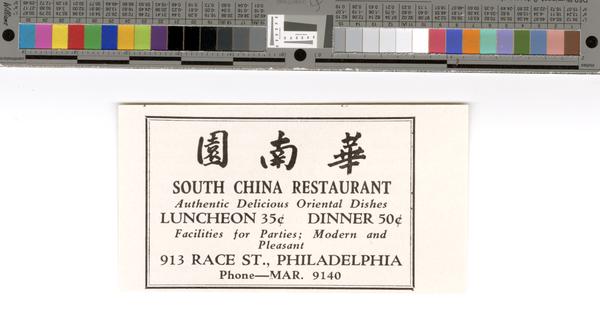 Clipping from a serial advertising the South China Restaurant located at 913 Race Street, Philadelphia and containing typography and pictorial elements. Includes Chinese characters and text promoting lunch and dinner at the restaurant. A black border surrounds the text.