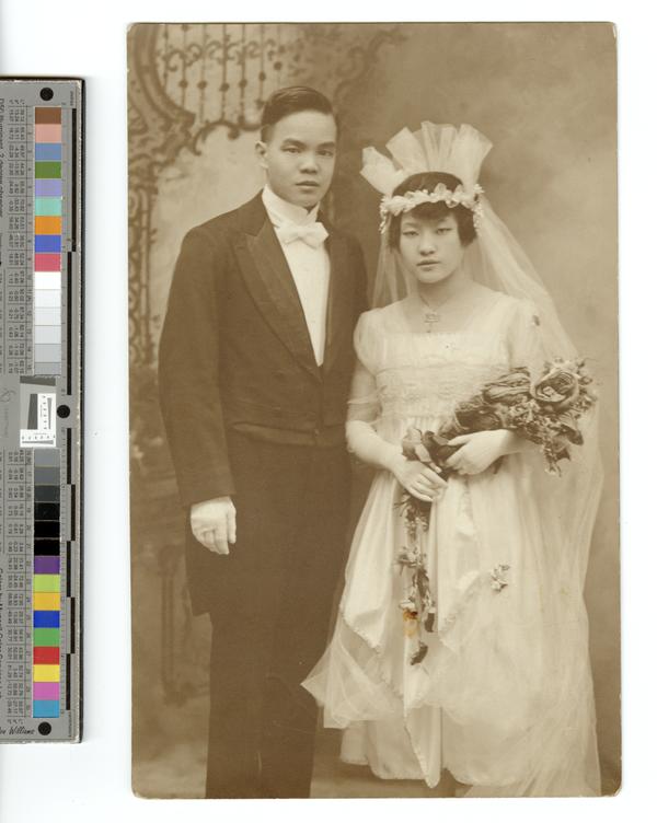 Three-quarter length studio portrait of Paul Lee and his newlywed wife in wedding attire. Shows the couple standing and facing
