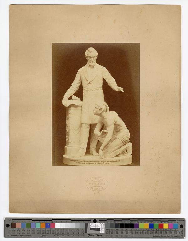 as a Lincoln monument in the later 1860s. Shows the model composed of a figure of Abraham Lincoln (left) and a kneeling, emancipated,