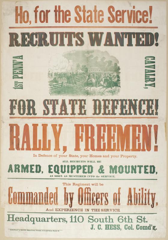 Ho, for the state service! Recruits wanted! 1st Penn'a Cavalry, for state defence! : Rally, freeman! In defence of your state,