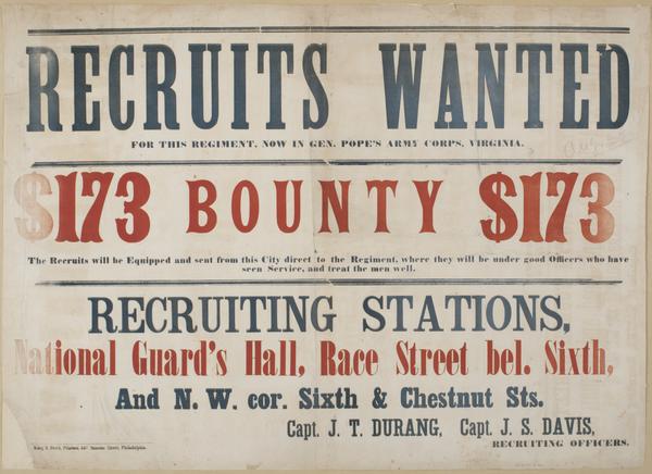 Recruits wanted for this regiment, now in Gen. Pope's Army Corps, Virginia. : $173 bounty $173 The recruits will be equipped and sent from this city direct to the regiment, where they will be under good officers who have seen service, and treat men well. Recruiting stations, National Guard's Hall, Race Street bel. Sixth and N.W. cor. Sixth & Chestnut Sts. / Capt J.T. Durang, Capt. J.S. Davis, recruiting officers.