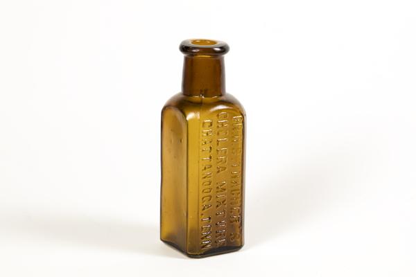 Patent medicine bottle made in amber glass. Reads along the side of the bottle, Dr. H.S. Thacher’s Cholera Mixture Chattanooga,