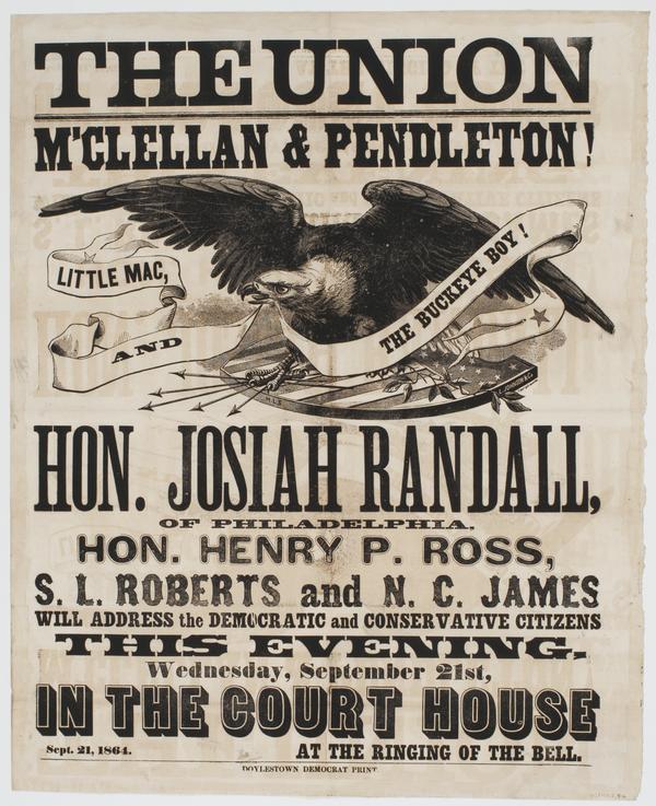 The Union M'Clellan & Pendleton! : Hon. Josiah Randall, of Philadelphia, Hon. Henry P. Ross, S.L. Roberts and N.C. James will address the Democratic and conservative citizens this evening, Wednesday, September 21st, in the Court House at the ringing of the bell. Sept. 21, 1864.