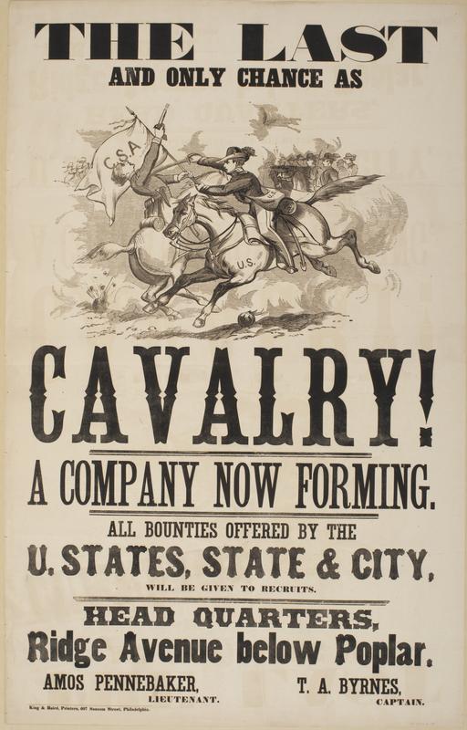 The Last and only chance as cavalry! : A company now forming. All bounties offered by the U. States, state & city, will be given to recruits. Head quarters, Ridge Avenue below Poplar. / Amos Pennebaker, Lieutenant. T.A. Byrnes, Captain.