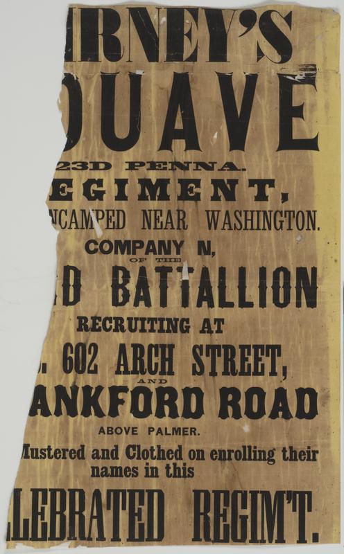 Birney's Zouave 23d Penna. [R]egiment, : [e]ncamped near Washington. Company N, of the [thir]d battalion recruiting at [No]. 602 Arch Street, and [Fr]ankford Road above Palmer. Mustered and clothed on enrolling their names in the [ce]elbrated regim't.
