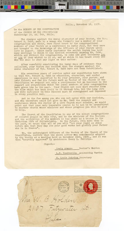 P.2022.16.79 &79a: Envelope and accompanying correspondence addressed to William B. Holden, November 16, 1928 about the “charges of the moral character of your Rector” of the Church of the Crucifixion