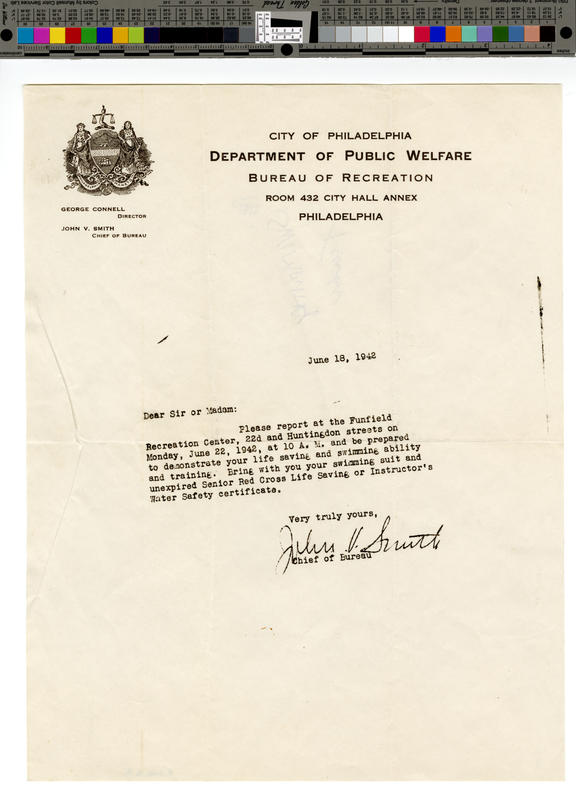 P.2022.16.81: Letter addressed to “Sir or Madam” from City of Philadelphia Department of Public Welfare, Bureau of Recreation about reporting to Funfield Recreation Center “to demonstrate your life saving and swimming ability and training,” June 18, 1942