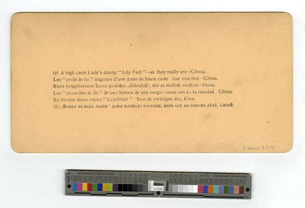 Stereograph depicting a Chinese woman's feet on display. Shows the woman from the waist down attired in a tunic and pants