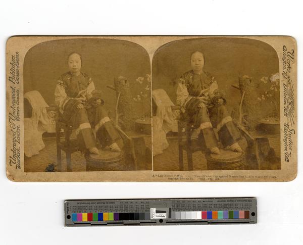 Stereograph depicting a full-length portrait of a Chinese woman with her bound feet on display. Shows the woman wearing her hair tied back and attired in a tunic and pants with decorative stripes and lotus shoes. She sits atop what is probably a wooden shelf with her feet resting on a circular wooden stool. She holds flowers in her left hand and looks slightly left. In the right is a tree stump and a flower pot on a wooden shelf. In the background are two chairs covered in cloth, and a patterned rug is on the floor.