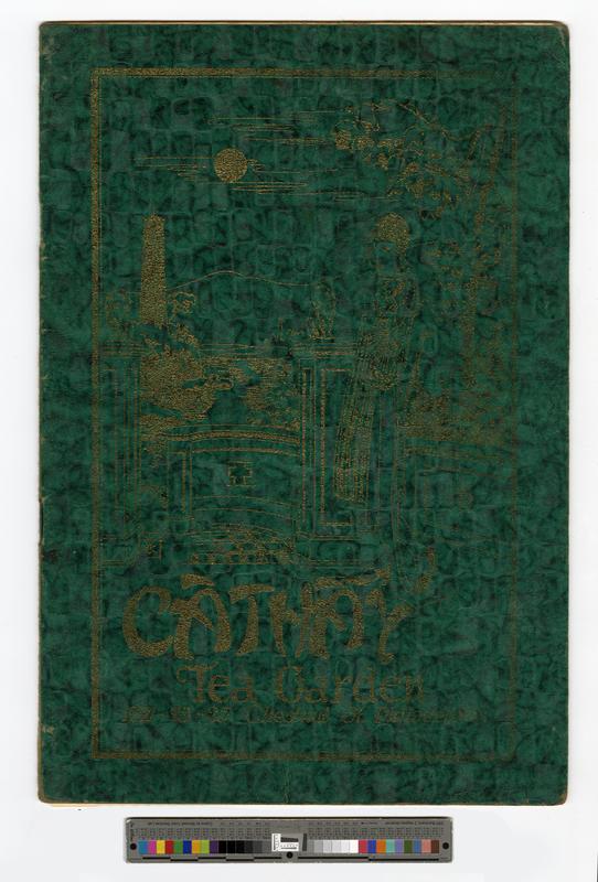 Menu for the Cathay Tea Garden located at 1221-1225 Chestnut Street, Philadelphia. The green and gold menu cover depicts a