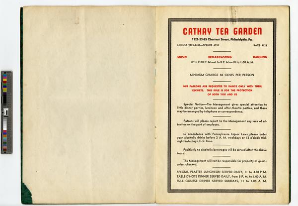 Menu for the Cathay Tea Garden located at 1221-1225 Chestnut Street, Philadelphia. The green and gold menu cover depicts a