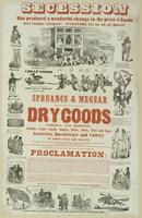 Secession has produced a wonderful change in the price of goods. : Great slaughter anticipated! "Watchword, give nor ask any quarters" Spruance & Megear are in the field with a terrible array of dry goods foreign and domestic. Notions, fancy goods, staples, boots, shoes, hats and caps, groceries, queensware and cutlery of every style and quality, etc., etc., right from Philadelphia, with the following inscription on their banner--"Extermination against all high prices and undue profits." To the public generally who wish to buy goods, we make the following proclamation: Being armed and equipped with such a stock of goods as cannot fail to strike the beholder with amazement ... we are determined to repulse if not entirely vanquish the great system of montrous prices and murderous profits ... Our facilities for purchasing goods in the East, gives us the advantage of the second handling from the manufacturer, instead of the third and fourth, thereby protecting our customers against the necessity of paying an extra tariff ... All kinds of country produce taken in exchange for goods. Smyrna, Del., April, 1861 / Spruance & Megear.