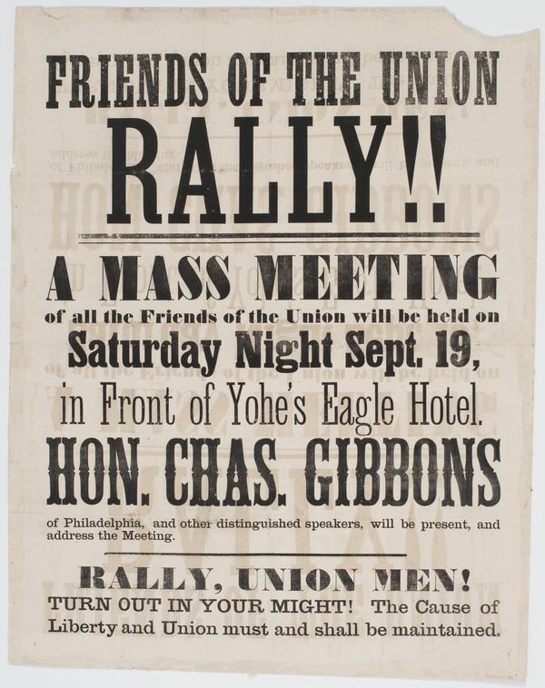 Friends of the Union Rally!! : A mass meeting of all the friends of the Union will be held on Saturday night Sept. 19, in front of Yohe's Eagle Hotel. Hon. Chas. Gibbons of Philadelphia, and other distinguished speakers, will be present, and address the meeting. Rally, Union men! Turn out in your might! The cause of liberty and Union must and shall be maintained.