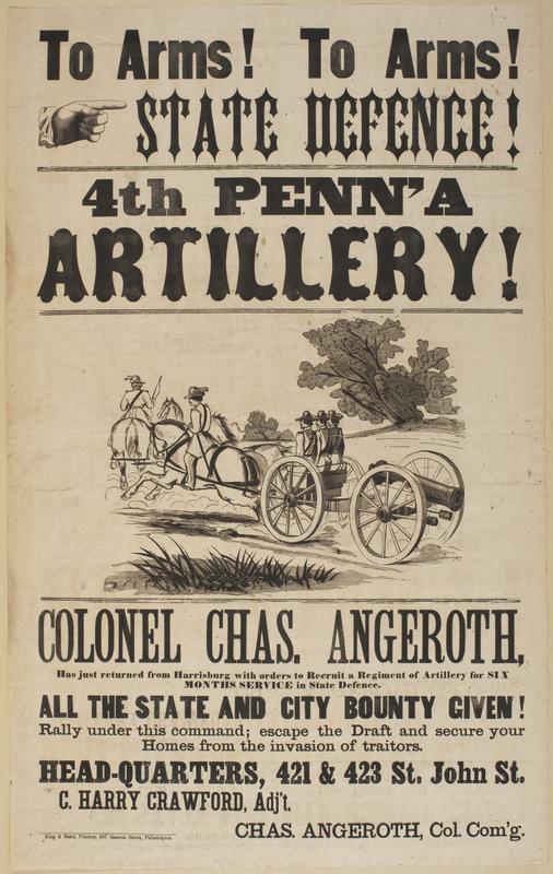 To arms! To arms! State defence! 4th Penn'a artillery! : Colonel Chas. Angeroth, has just returned from Harrisburg with orders to recruit a regiment of artillery for six months service in the state defence. All the state and city bounty given! Rally under this command; escape the draft and secure your homes from the invasion of traitors. Head-quarters, 421 & 423 St. John St. / C. Harry Crawford, adj't. Chas. Angeroth, col. com'g.