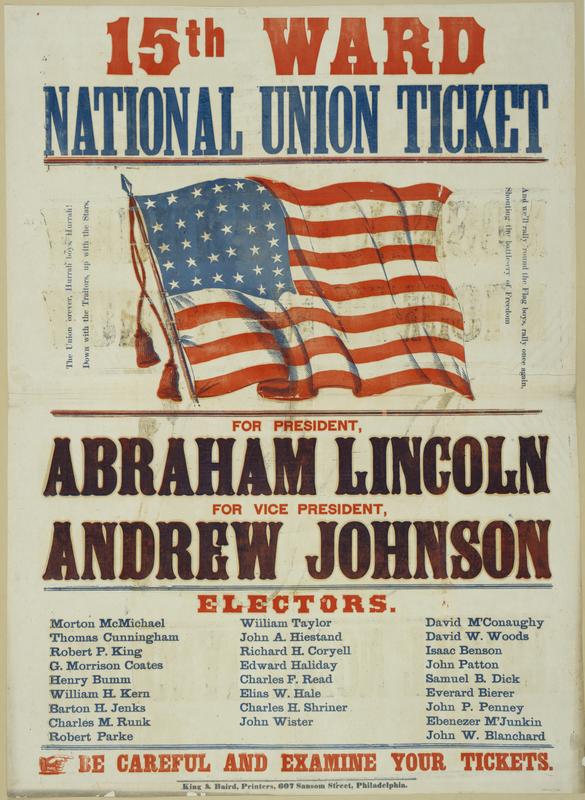 15th Ward National Union ticket : For president, Abraham Lincoln For vice president, Andrew John Electors. Morton McMichael ... Be careful and examine you tickets.