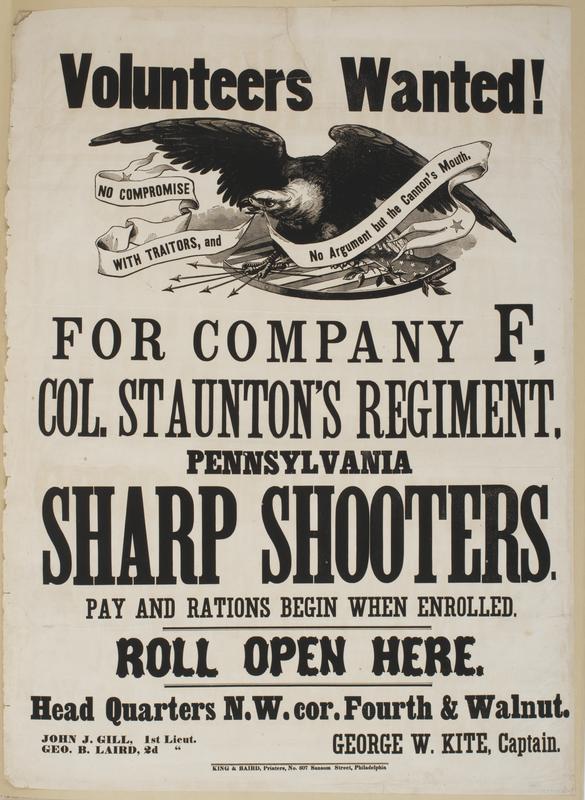 Volunteers wanted! For Company F, Col. Staunton's regiment, Pennsylvania sharp shooters. : Pay and rations begin when enrolled. Roll open here. Head quarters N.W. cor. Fourth & Walnut. / John J. Gill, 1st Lieut. Geo. B. Laird, 2d " George W. Kite, Captain.