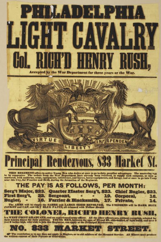 Philadelphia Light Cavalry Col. Rich'd Henry Rush, accepted by the War Department for three years or the war. : Principal rendezvous, 833 Market St. This regiment offers to active young men who desire at once to go to duty, peculiar advantages. The mustering will be by companies. The orders from the War Department have already been received, to supply each company, as soon as mustered, with uniforms, arms, equipments, subsistence, and horses, horse-equipments, and forage, and at once to go into camp near this city, for practice and drill, during the formation of the regiment. The pay is as follows, ... The arms will be simply the sabre and large sized revolver. The uniforms will be dark blue jacket and cap, and sky blue pants, all trimmed with yellow braid. The colonel, Rich'd Henry Rush, is a West Point graduate, and an experienced army officer. All the other officers are, without exception, selected for their known fitness for their positions. Young men, between the ages of 18 and 28, able-bodied, of light build, and over 5 feet 6 inches high, who wish to join this regiment, can apply at the principal rendezvous, No. 833 Market Street. The restriction as to age does not apply to buglers, or to old soldiers of the mounted service. All minors must produce the written consent of their parents or guardians.