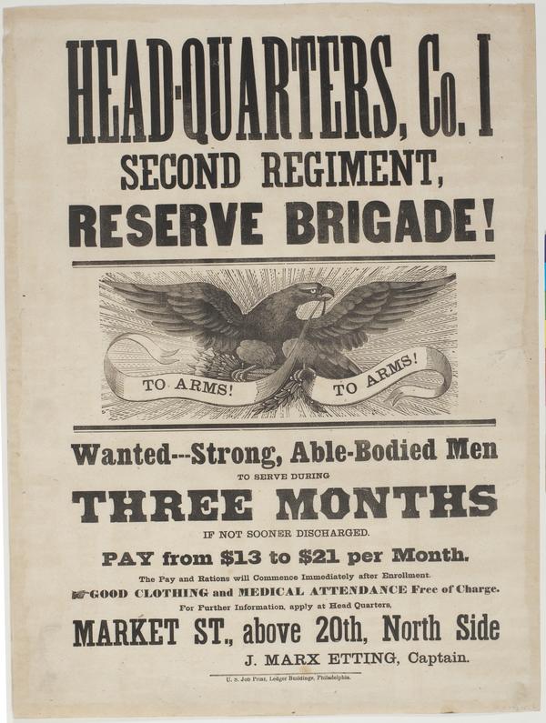 Head-quarters, Co. I Second Regiment, Reserve Brigade! : Wanted---strong, able-bodied men to serve during three months if not sooner discharged. Pay from $13 to $21 per month. The pay and rations will commence immediately after enrollment. Good clothing and medical attendance free of charge. For further information, apply at head quarters, Market St., above 20th, North side / J. Marx Etting, Captain.