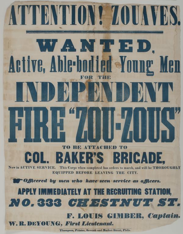 Attention! Zouaves. : Wanted, active, able-bodied young men for the independent Fire "Zou-Zous" to be attached to Col. Baker's brigade, now in active service. This corps when completed has orders to march, and will be thoroughly equipped before leaving the city. Officered by men who have seen service as officers. Apply immediately at the recruiting station, No. 333 Chestnut St. / F. Louis Gimber, Captain. W.R. DeYoung, First Lieutenant.