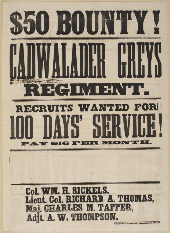 $50 bounty! Cadwalader Greys Regiment. : Recruits wanted for 100 days' service! Pay $16 per month. / Col. Wm. H. Sickels, Lieut. Col. Richard A. Thomas, Maj. Charles M. Tapper, Adjt. A.W. Thompson.