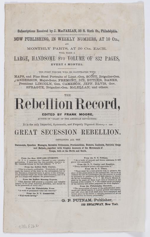 Now publishing, in weekly numbers, : at 10 cts., and monthly parts, at 50 cts. each. Will make a large, handsome 8vo volume of 832 pages, every six months. The first volume will be illustrated with maps, and fine steel portraits ... The Rebellion record, edited by Frank Moore, author of "Diary of the American Revolution." It is the only impartial, systematic, and properly digested history of the great secession Rebellion. Containing all the documents, speeches, messages, seccession ordinances, proclamation, rumors, incidents, patriotic songs and ballads, together with graphic accounts of the movements of troops, both at the North and South. ... / G.P. Putnam, publisher, 532 Broadway, New York.