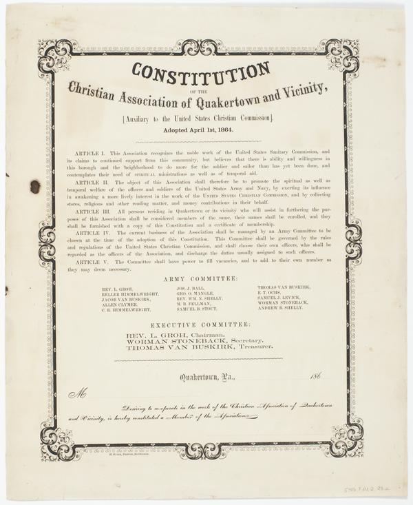 Constitution of the Christian Association of Quakertown and Vicinity, : (auxiliary to the United States Christian Commission). Adopted April 1st, 1864. ... The object of this association shall therefore be to promote the spiritual as well as temporal welfare of the officers and soldiers of the United States Army and Navy, ... / Executive committee: Rev. L. Groh, chairman. Worman Stoneback, secretary. Thomas Van Buskirk, treasurer. ...