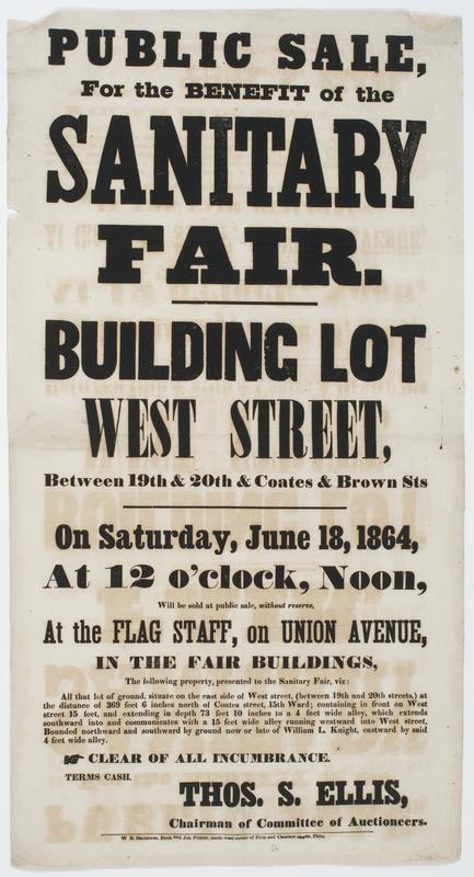 Public sale, for the benefit of the Sanitary Fair. : Building lot West Street, between 19th & 20th & Coates & Brown Sts On Saturday, June 18, 1864, at 12 o'clock, noon, will be sold at public sale, without reserve, at the flag staff, on Union Avenue, in the fair buildings, the following property, presented to the Sanitary Fair, ... Clear of all incumbrance. Terms cash. / Thos. S. Ellis, chairman of Committee of Auctioneers.
