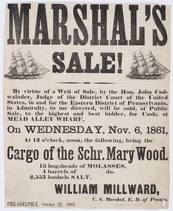 Marshal's sale! : By virtue of a writ of sale, by the Hon. John Cadwalader, judge of the District Court of the United States, in and for the Eastern District of Pennsylvania, in Admiralty, to me directed, will be sold, at public sale, to the highest and best bidder, for cash, at the Mead Alley Wharf, on Wednesday, Nov. 6, 1861, at 12 o'clock, noon, the following, being the cargo of the schr. Mary Wood. 15 hogsheads of molasses, 4 barrels of do. 2,553 bushels salt. / William Millward, U.S. Marshal, E.D. of Penn'a. Philadelphia, October 21, 1861.