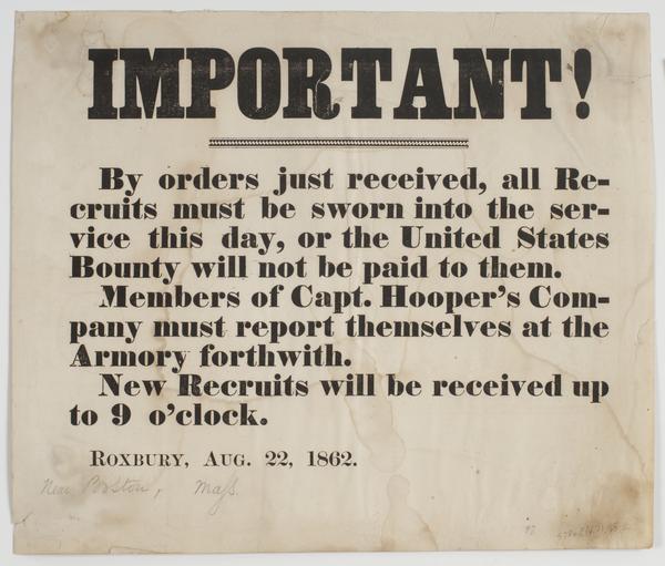 Important! By orders just received, : all recruits must be sworn into the service this day, or the United States bounty will not be paid to them. Members of Capt. Hooper's company must report themselves at the armory forthwith. New recruits will be received up to 9 o'clock. Roxbury, Aug. 22, 1862.