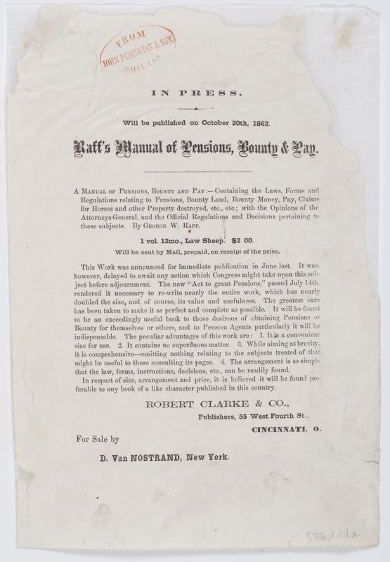 In press. Will be published on October 20th, 1862. Raff's Manual of pensions, bounty & pay. : A manual of pensions, bounty and pay:--Containing the laws, forms and regulations relating to pensions, ... By George W. Raff. 1 vol. 12mo., law sheep. $2 00. Will be sent by mail, prepaid, on receipt of the price. This work was announced for immediate publication in June last. It was, however, delayed to await any action which Congress might take upon this subject before adjournment. The new "Act to grant pensions," passed July 14th, rendered it necessary to re-write nearly the entire work, ... / Robert Clarke & Co., publishers, 55 West Fourth St., Cincinnati, O. For sale by D. Van Nostrand, New York.
