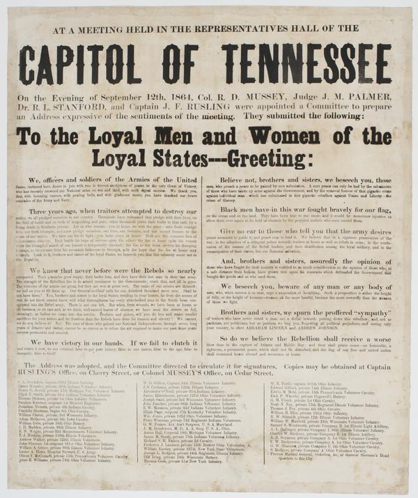 At a meeting in the Representatives Hall of the capitol of Tennessee : on the evening of September 12th, 1864, Col. R.D. Mussey, Judge J.M. Palmer, Dr. R.L. Stanford, and Captain J.F. Rusling were appointed to prepare an address expressive of the sentiments of the meeting. They submitted the following: To the loyal men and women of the loyal states---Greeting: We, officers and soldiers of the armies of the United States, stationed here, desire to join with you in devout ascriptions to the only giver of victory, ... Three years ago, when traitors attempted to destroy our nation, we all pledged ourselves to our country. ... We know that never before were the Rebels so nearly conquered. ... We have victory in our hands. If we fail to clutch it and retain it now, we are criminal, ... Believe not, brothers and sisters, we beseech you, those men, who preach a peace to be gained by our submission. ... Black men have in this war fought bravely for our flag, on the ocean and on the land. They have been true to our cause, and it would be monstrous injustice to allow them ever again to be held as chattels by the perjured traitors who once owned them. ... Brothers and sisters, we spurn the proffered "sympathy" of traitors who have never voted a man nor a dollar towards putting down this rebellion; and, not as partizans, nor politicians, but as patriots, we beg you, ... to elect Abraham Lincoln and Andrew Johnson. ...
