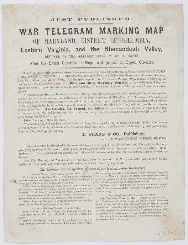 Just published. War telegram marking map of Maryland, District of Columbia, Eastern Virginia, and the Shenandoah Valley, : designed on the grandest scale, 26 by 38 inches, after the latest government maps, and printed in brown oil-color. This map gives, with the utmost distinctness, every inch of ground where the Union forces, under Pope, Burnside, McClellan, Banks, Sigel, &c. &c., are opposed to the Rebels under Stonewall Jackson, Johnson, Lee, Beauregard, and Jeff. Davis. It is designed expressly for the use of a marking map; that is, to follow up the positions of the respective armies with red and blue marking pencils, as the daily war telegrams report the same; to gain by this means an understanding of the whole situation of the opposing forces at a single glance. For schools, no map can be better adapted. ... Price, for single map, 25 cents. Wholesale price, $15 per hundred, sent free of charge to any part of the country, on receipt of the price, in current money, provided the wholesale order is not less than one dozen. Small parcels will be sent by mail, folded up; large parcels, rolled up, by express. / L. Prang & Co., publishers, No. 109, Washington Street, Boston. ...