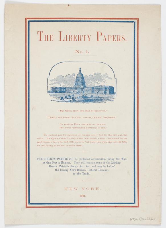 The Liberty papers. No. 1. : We contend not for ourselves or country solely, but for the race and the world. We fight for that liberty which will enable a man, surrounded by his aged parents, his wife, and little ones, to "sit under his own vine and fig tree, no one daring to molest or make afraid." The liberty papers will be published occasionally, during the war, at one cent a number. They will contain some of the leading events, patriotic songs, &c., &c., and may be had of the leading news dealers. Liberal discount to the trade.