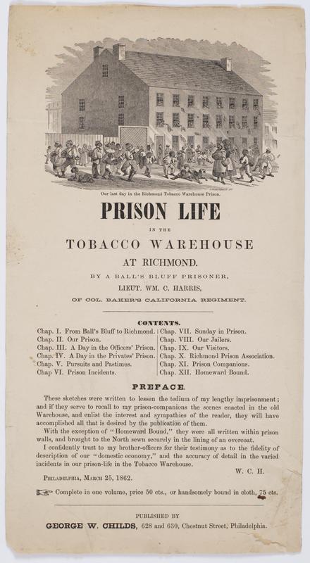 Prison life in the tobacco warehouse at Richmond. / By a Ball's Bluff prisoner, Lieut. Wm. C. Harris, of Col. Baker's California Regiment. Contents. ... Preface. ...Philadelphia, March 25, 1862. Complete in one volume, price 50 cts., or handsomely bound in cloth, 75 cts.