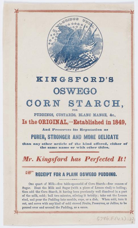 Kingford's Oswego corn starch, : for puddings, custards, blanc mange, &c., is the original,--established in 1849, and preserves its reputation as purer, stronger and mor delicate than any other article of the kind offered, either of the same name or with other titles. Mr. Kingsford has perfected it! Receipt for a plain Oswego pudding. ...