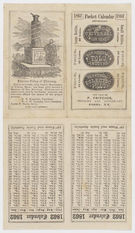 Pocket calendar : describing Hunnewell's Universal Cough Remedy Hunnewell's Tolu Anodyne Hunnewell's Eclectic pills / For sale by P. Fritcher, druggist and apothedcary Fonda. N.Y.