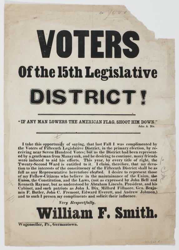 Voters of the 15th legislative district! : "If any man lowers the American flag, shoot him down." John A. Dix. I take this opportunily [sic] of saying, that last fall I was complimented by the voters of the fifteenth legislative district, in the primary election, by receiving near seven hundred votes; but as the district had been represented by a gentleman from Manayunk, and he desiring to continue, many friends were induced to aid his efforts. This year, by every title of right, the Twenty-Second Ward is entitled to it[.] I claim, therefore, that my devotion to the interests of the constituency of the fifteenth district shall be as full as any representative heretofore eleeted [sic]. ... / Very respectfully, William F. Smith.