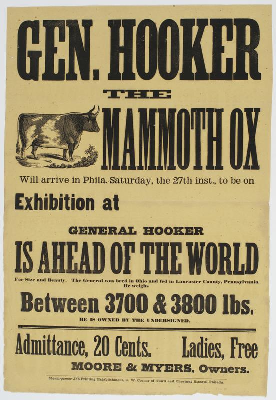 Gen. Hooker the mammoth ox : will arrive in Phila. Saturday, the 27th inst., to be on exhibition at [blank] General Hooker is ahead of the world for size and beauty. The general was bred in Ohio and fed in Lancaster County, Pennsylvania He weighs between 3700 & 3800 lbs. He is owned by the undersigned. Admittance, 20 cents. Ladies, free / Moore & Myers, owners.