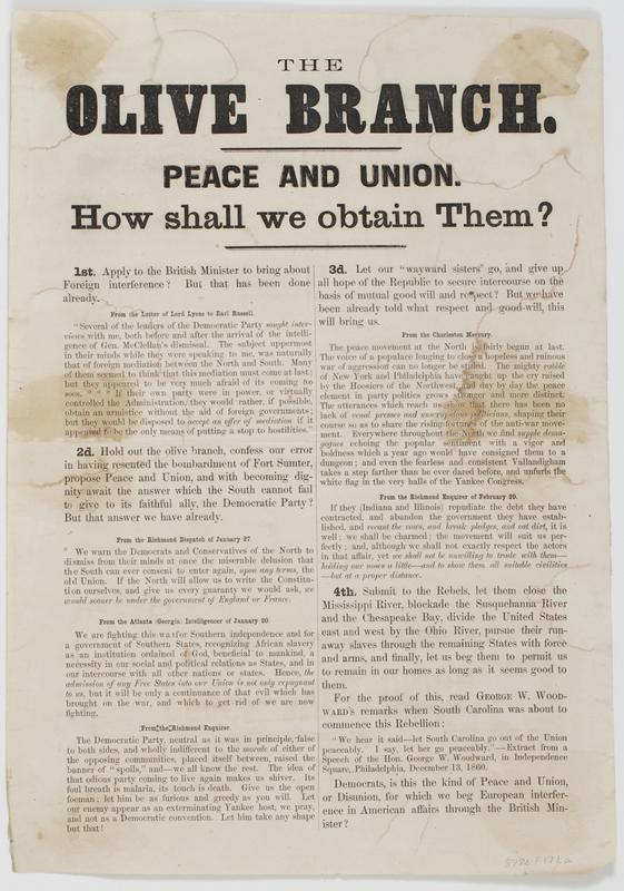 The Olive branch. Peace and union. How shall we obtain them? : 1st. Apply to the British minister to bring about foreign interference? ... 2d. Hold out the olive branch, confess our error in having resented the bombardment for Fort Sumter, propose peace and union, and with becoming dignity await the answer which the South cannot fail to give to its faithful ally, the Democratic Party? ... 3d. Let our "wayward sisters" go, and give up all hope of the Republic to secure intercourse on the basis of mutual good will and respect? ... 4th. Submit to the Rebels, let them close the Mississippi River, blockade the Susquehanna River and the Chesapeake Bay, divide the United States east and west by the Ohio River, pursue their run-away slaves through the remaining states with force and arms, and finally, let us beg them to permit us to remain in our homes as long as it seems good to them. ... Democrats, is this the kind of peace and union, or disunion, for which we beg the European interference in American affairs through the British ministers?