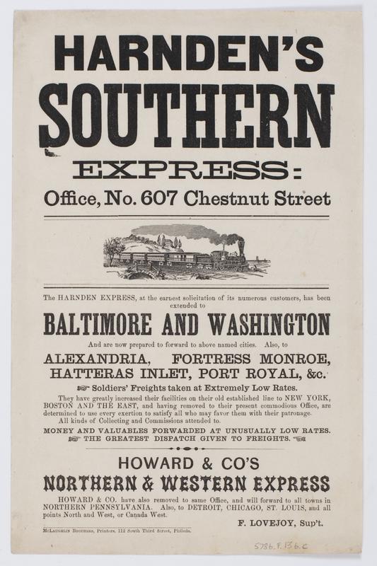 Harnden's southern express: : office, No. 607 Chestnut Street The Harnden express, at the earnest solicitation of its numerous customers, has been extended to Baltimore and Washington and are now prepared to forward to above named cities. Also, to Alexandria, Fortress Monroe, Hatteras Inlet, Port Royal, &c. Soldiers' freights taken at extremely low rates. They have greatly increased their facilities on their old established line to New York, Boston and the East, and having removed to their present commodious office, are determined to use every exertion to satisfy all who may favor them with their patronage. All kinds of collecting and commissions attended to. Money and valuables forwarded at unusually low rates. The greatest dispatch given to freights. Howard & Co's northern & western express Howard & Co. have also removed to same office, and will forward to all towns in Northern Pennsylvania. Also, to Detroit, Chicago, St. Louis, and all points North and West, or Canada West. / F. Lovejoy, sup't.