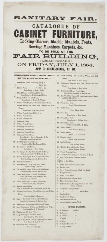 Sanitary Fair. : Catalogue of cabinet furniture, looking-glasses, marble mantels, fonts, sewing machines, carpets, &c. to be sold at the fair building, (Logan Square.) On Friday, July 1, 1864, at 1 o'clock, p.m. ...
