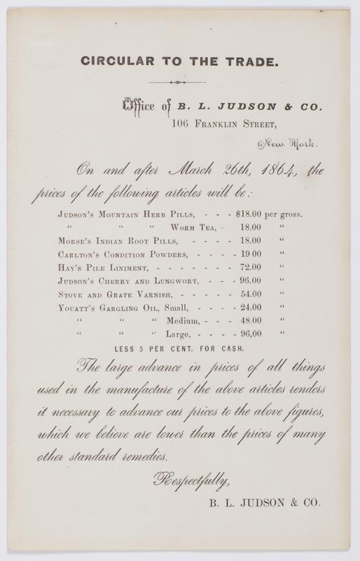 Circular to the trade. : Office of B.L. Judson & Co. 106 Franklin Street, New York. On and after March 26th, 1864, the prices of the following articles will be: ... The large advance in prices of all things used in the manufacture of the above articles renders it necessary to advance our prices to the above figures, which we believe are lower than the prices of many other standard remedies. / Respectfully, B.L. Judson & Co.