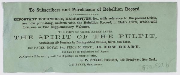 To the subscribers and purchasers of Rebellion record. : Important documents, narratives, &c., with reference to the present crisis, are now publishing, uniform with the Rebellion record, in extra parts, which will form one or two supplementary volumes. The first of these extra parts, The spirit of the pulpit, containing 20 sermons by distinguished divines, North and South, 160 pages, royal 8vo, price 50 cents, is now ready. For sale by all booksellers and agents. Copies will be sent by mail free of postage, on receipt of price. / G.P. Putnam, publisher, 532 Broadway, New York. C.T. Evans, gen. agent.