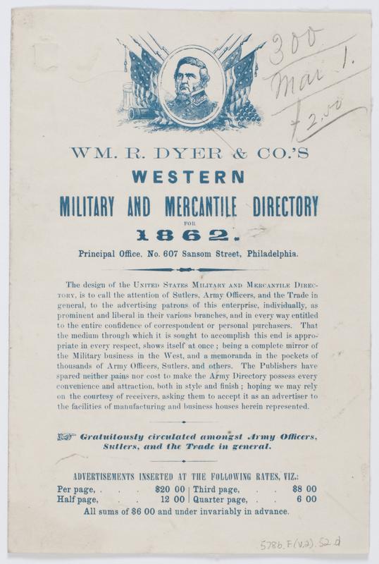 Wm. R. Dyer & Co.'s Western and mercantile directory for 1862. : Principal office, No. 607 Sansom Street, Philadelphia. The design of the United States military and mercantile directory, is to call the attention of sutlers, army officers, and the trade in general, to the advertising patrons of this enterprise, ... Advertisements inserted at the following rates, viz.: Per page, $20 00 ...