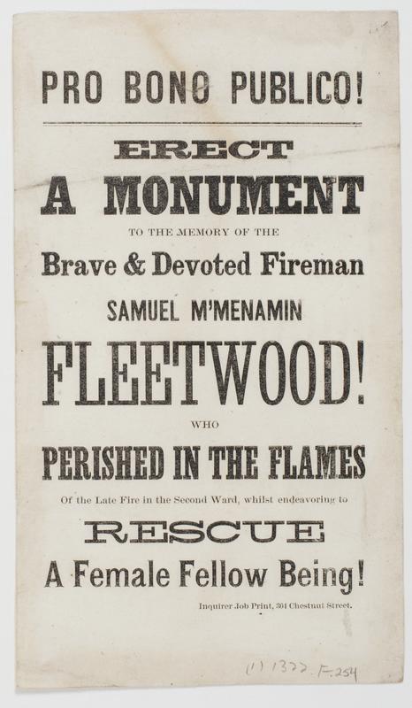 Pro bono publico! Erect a monument to the memory of the brave & devoted fireman Samuel M'Menamin Fleetwood! : who perished in the flames of the late fire in the Second Ward, whilst endeavoring to rescue a female fellow being!