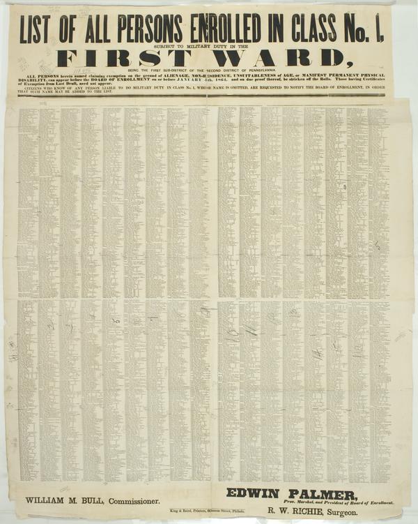 List of all persons enrolled in Class No. 1, subject to military duty in the First Ward, : being the first sub-district of the second district of Pennsylvania. All persons herein named claiming exemption on the ground of alienage, non-residence, unsuitableness of age, or manifest permanent physical disability, can appear before the Board of Enrollment on or before January 5th, 1864, and on due proof thereof, be stricken off the rolls. Those having certificates of exemption from last draft, need not appear. Citizens who know of any person liable to do military duty in Class No. 1, whose name is omitted, are requested to notify the Board of Enrollment, in order that such name may be added to the list. ... / William M. Bull, commissioner, Edwin Palmer, Prov. Marshal, and President of Board of Enrollment. R.W. Richie, surgeon.