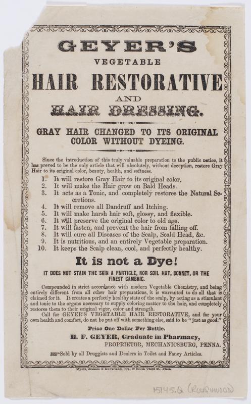 Geyer's vegetable hair restorative and hair dressing. : Gray hair changed to it original color without dyeing. Since the introduction of this truly valuable preparation to the public notice, it has proved to be the only article that will absolutely, without deception, restore gray hair to its original color, beauty, health, and softness. ... It is not a dye! It does not stain the skin a particle, nor soil hat, bonnet, or the finest cambric. Compounded in strict accordance with modern vegetable chemistry, and being entirely different from all other hair preparations, it is warranted to do all that is claimed for it. ... Call for Geyer's vegetable hair restorative, and for your own health and comfort, do not be put off with something else, said to be "just as good." Price one dollar per bottle. / H.F. Geyer, graduate in pharmacy, proprietor, Mechanicsburg, Penna. Sold by all druggists and dealers in toilet and fancy articles.