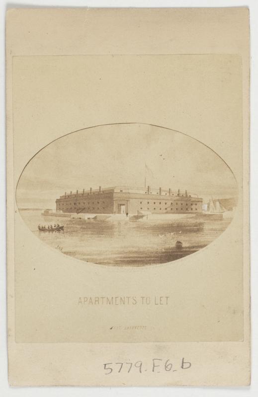 Satiric carte de visite of a reproduction of a drawing of the New York island fort opposite Fort Hamilton used a a prison during the Civil War. Includes a boat of prisoners being rowed to the facility. The fort, completed circa 1818, was the first Northern location to receive prisoners of war in July 1861. Fort was razed in 1960.