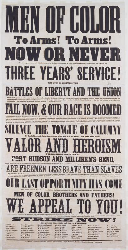Broadside continues: This is our golden moment! The government of the United States calls for every able-bodied colored man to enter the army for the three years' service! And join in fighting the battles of liberty and the Union. A new era is open to us ... Fail now and our race is doomed ... Strike now, and you are henceforth and forever freemen!